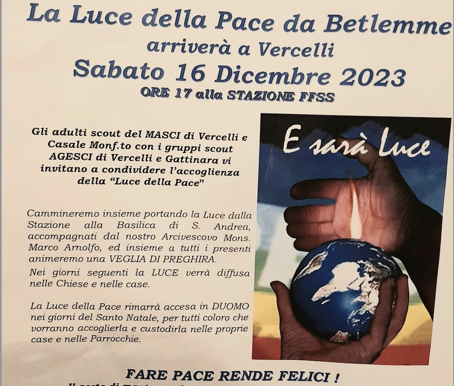 La luce della pace di Betlemme arriverà a Vercelli, alla stazione ferroviaria, sabato 16 dicembre, alle ore 17.
