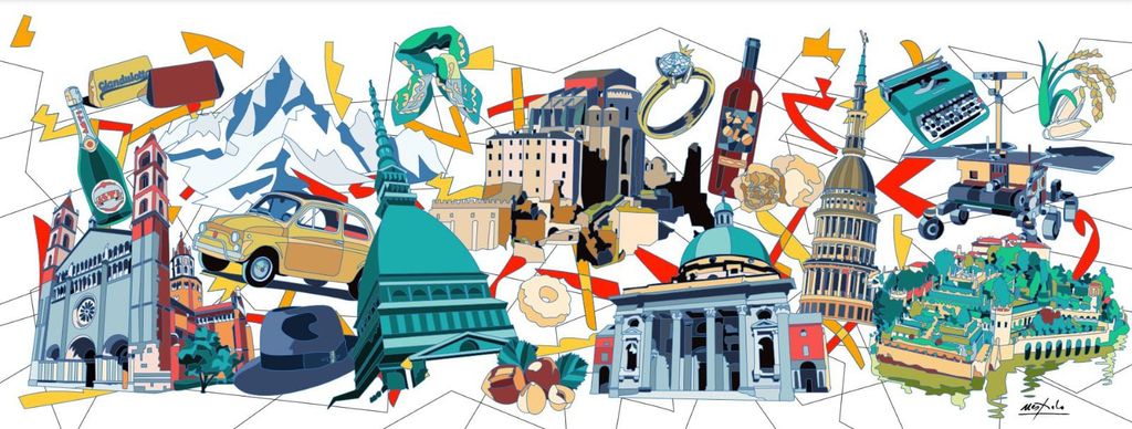 Nell’opera si può vedere la Basilica di Sant’Andrea di Vercelli, l’Alta Langa, il Monviso, la Mole, la Sacra di San Michele, il Santuario di Oropa, la Basilica di San Gaudenzio a Novara, le Isole Borromee, la 500, il gianduiotto, il cappello Borsalino, il tessile biellese, i canestrelli, le nocciole IGP, l’oreficeria di Valenza, il Barolo, il tartufo, il patrimonio letterario e gli scrittori della regione, la macchina da scrivere simbolo di Ivrea e dell’ingegno di Olivetti, il riso, l’aerospazio.