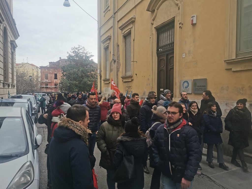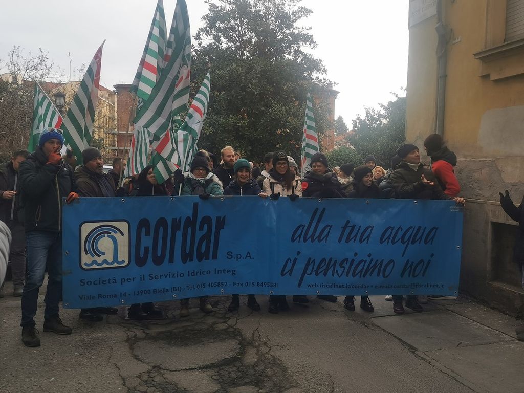 In via Carducci, fin dal primo pomeriggio, sindacati e lavoratori del settore, per lo più provenienti da biellese, casalese e Valsesia, si sono dati appuntamento per un presidio nel corso del quale è stata sostenuta a gran voce la richiesta dell'affidamento inhouse del servizio. Una soluzione per la quale si batte anche Bcv Acque, la società nata dall'unione di Cordar Biella, Cordar Valsesia, Am+ e Sii, gestori controllati dal pubblico. Almeno un centinaio i dipendenti delle società idriche che hanno manifestato insieme ai rappresentanti di Filctem Cgil, Femca Cisl e Uiltec Uil, che chiedono «certezze per i 300 addetti del settore, responsabilità sociale nella gestione dell'acqua e nella qualità del lavoro».