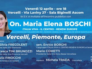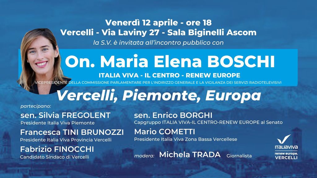 Venerdì alle 18, alla sala Biginelli dell'Ascom, incontro pubblico sul tema “Vercelli, Piemonte, Europa", organizzato da Italia Viva e Azione con i parlamentari Maria Elena Boschi, Silvia Fregolent ed Enrico Borghi. Al dibattito prendono parte il candidato sindaco Fabrizio Finocchi, Francesca Tini Brunozzi (presidente provinciale di Italia Viva) e Mario Cometti (presidente di Italia Viva del Vercellese). Modera la giornalista Michela Trada.