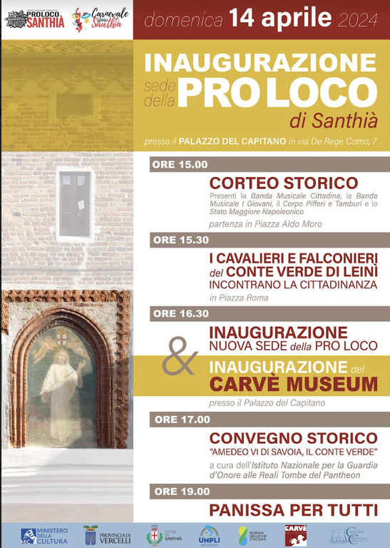 Il taglio del nastro sarà il culmine di una giornata di celebrazioni in grande stile che coinvolgeranno tutta Santhià, con un ampio programma di iniziative pubbliche dedicate alla cittadinanza e agli ospiti che vorranno cogliere l’occasione per visitare il borgo. Il fitto programma prenderà il via alle ore 15.00 con il corteo storico lungo Corso Nuova Italia che vedrà la Banda Musicale Cittadina, la Banda Musicale I Giovani, il Corpo Pifferi e Tamburi e lo Stato Maggiore Napoleonico sfilare insieme ai Cavalieri e Falconieri del Conte Verde fino in Piazza Roma. Al termine dell’esibizione ci si sposterà al Palazzo del Capitano dove, dopo la cerimonia di inaugurazione del Carvè Museum e della nuova Sede della Pro Loco, si terrà il convegno “Amedeo di Savoia, il Conte Verde”, a cura