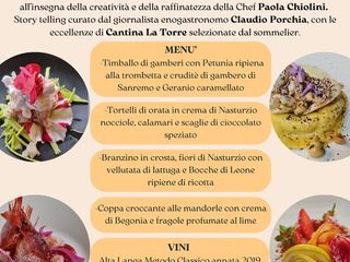 All’interno di una location panoramica e di grande fascino, la Torre Crystallina, potrete gustare la raffinatezza e la creatività dei piatti della chef Paola Chiolini del ristorante la Balena Bianca di Vallecrosia (IM) abbinati ad una selezione di vini curata dai sommelier Fisar. Inoltre lo storytelling della serata curato dal giornalista enogastronomo Claudio Porchia accompagnerà i partecipanti alla scoperta della cucina con i Fiori. Dalle note di amaro della Bocca di Leone, a quelle piccanti del Nasturzio, passando per il sapore agrumato della Begonia e dal gusto erbaceo del Geranio per terminare con la freschezza della Petunia. Non solo una serata dedicata al gusto, ma anche alle emozioni che solo i fiori riescono a dare.