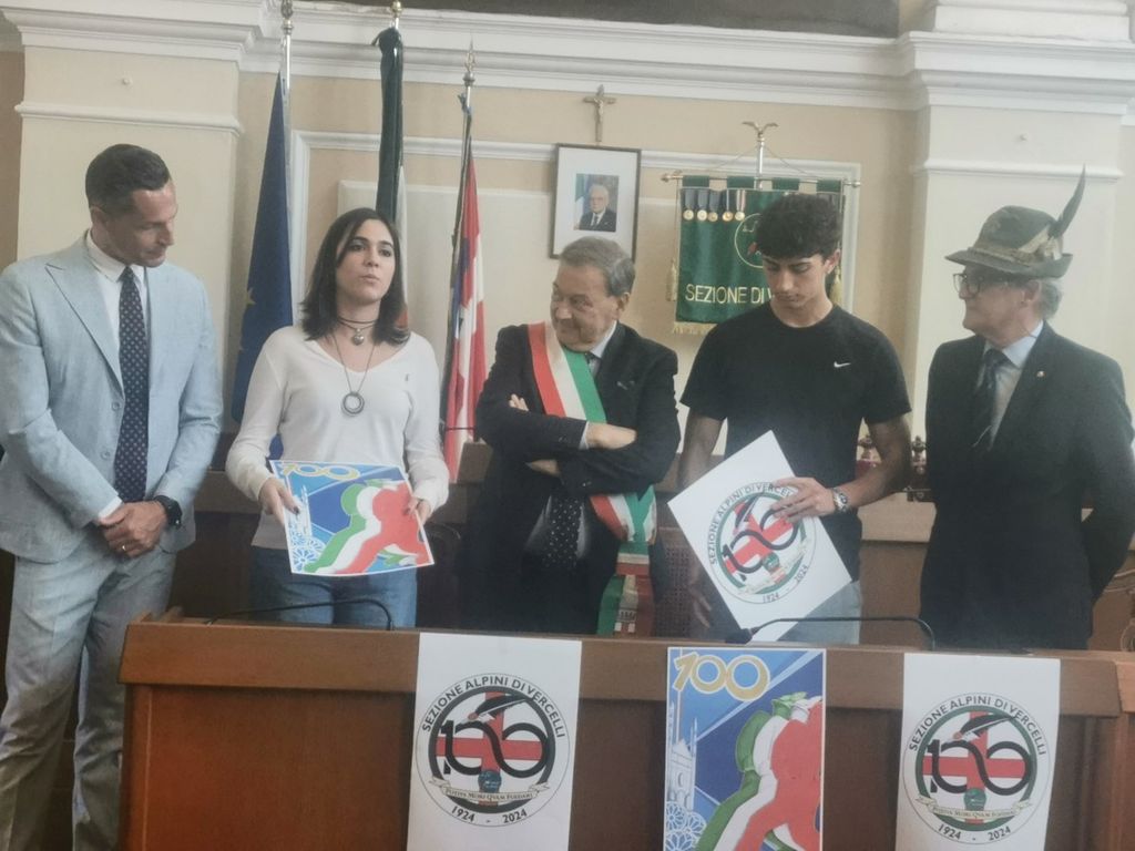 Lucilla Viazzo, studentessa della IV D del Liceo artistico Alciati, si è aggiudicata il premio per il manifesto realizzando un Tricolore, incarnato da tre Alpini in marcia verso la facciata di Sant'Andrea. Luca Bullano, 5ª Chimici all'Iti Faccio, ha vinto il primo premio per il loro: nel suo lavoro il numero 100, tracciato da una penna alpina, si trasforma nel simbolo dell'infinito per avvolgere la croce del gonfalone della città di Vercelli.