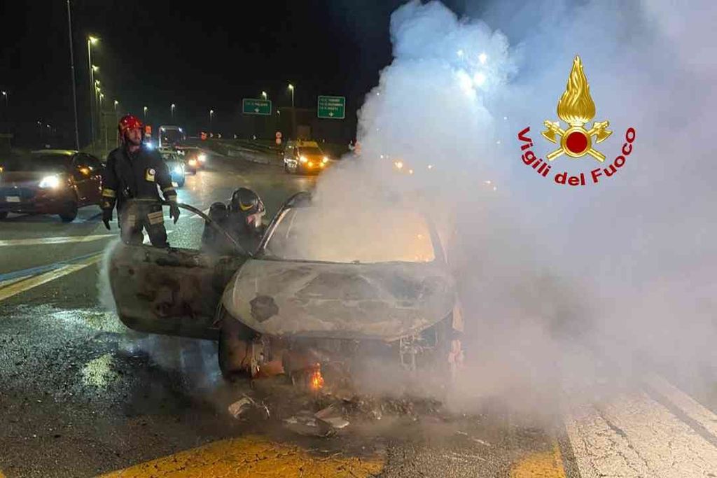 Auto a fuoco, nella notte tra sabato e domenica, in prossimità del casello di Carisio sulla A4 Torino - Milano.
