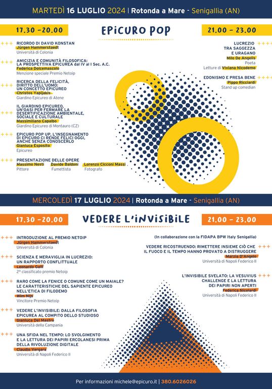 La giornata di martedì 16 sarà dedicata ad un “Epicuro Pop”: dalle 17.30 alle 20 si terranno una serie di incontri, tutti ad ingresso libero, dedicati alla felicità, all’amicizia, ma anche al ricordo. Il primo a prendere la parola, infatti, sarà Jürgen Hammerstaedt, dell’università di Colonia, che ricorderà David Konstan, professore di lettere classiche e noto ricercatore americano.