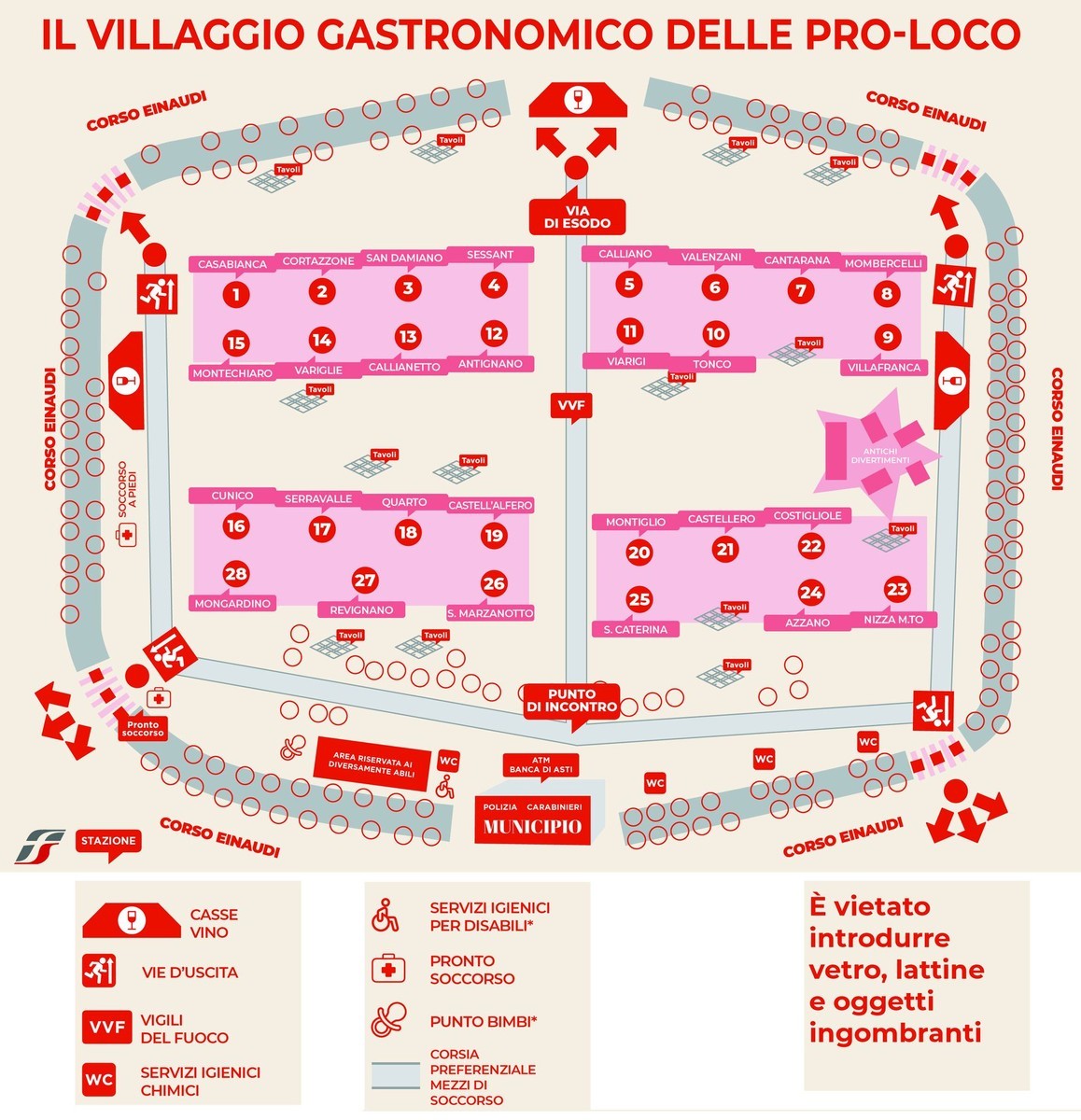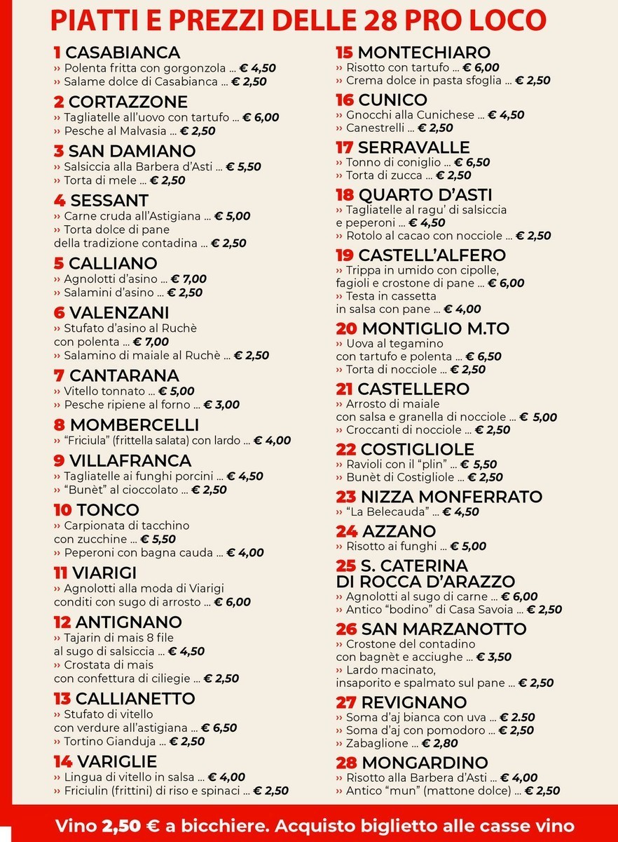 Si apre sabato 7 settembre dalle 18:30 alle 23:30 (i dolci verranno serviti fino alle 24). Domenica 8 settembre - dopo la sfilata contadina del mattino che partirà alle 9.30 da corso Matteotti - sarà possibile pranzare dalle 11:30 alle 22:00. I vini Doc e Docg delle aziende aderenti al Consorzio Barbera d’Asti e Vini d’Asti e del Monferrato saranno disponibili, con acquisto del biglietto presso le “casse vino” al prezzo unico di 2,50 euro. Il vino sarà distribuito dalle stesse pro loco ma non sarà vincolato all'acquisto del piatto. Saranno circa 150 i tavoli allestiti, sotto le piante, e le casette saranno dislocate "schiena contro schiena" in quattro 'isole' in mezzo alla piazza con lo spazio per tavoli e sedie.