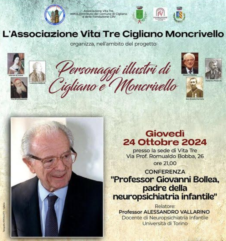 Nell'ambito della rassegna "personaggi illustri di Cigliano e Moncrivello" viene ricordata la figura di Giovanni Bollea, professore e psichiatra, nato a Cigliano nel 1913 e morto a Roma nel 2011, è considerato il padre della neuropsichiatria infantile. Relatore della serata, in programma il 24 ottobre (ore 21) presso il salone di Vita Tre in Via Professore Romualdo Bobba, 26, il professor Alessandro Vallarino, docente di neuropsichiatria infantile presso l'Università di Torino