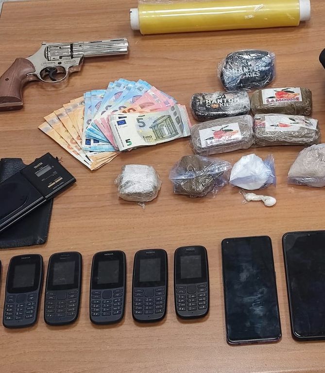 A completamento delle attività svolte, i Carabinieri e gli operatori della Polizia di Stato, nel corso della serata, con l’ausilio del reporter, hanno ricostruito il percorso di fuga del soggetto e quindi svolto una più ampia e minuziosa attività di ricerca nella vasta area verde dove si erano svolti i fatti e hanno rinvenuto, all’interno di uno zaino ritrovato in quell’area 564,4 grammi di hashish, 57,05 grammi di eroina, 21,43 grammi di cocaina, un coltello, un bilancino elettronico e un revolver privo di tappo rosso, perfetta riproduzione dell’originale, oltre a 570 euro in banconote di vario taglio, sequestrandoli.