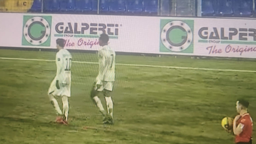 Testa di Ferrini, a lato. Il Lecco ora sta giocando meglio.