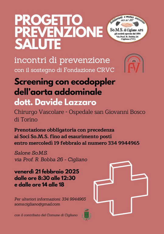 Nell'ambito del Progetto Prevenzione Salute sostenuto dalla Fondazione Cassa di Risparmio di Vercelli, riprendono le attivita' di prevenzione mediante screening della So.M.S. di Cigliano.
