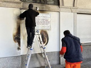 Grave atto vandalico, nella notte tra lunedì e martedì, in piazza Municipio: un uomo, ripreso dalle telecamere, ha incendiato una delle corone d'alloro poste sotto la lapide che ricorda le vittime delle Foibe, danneggiando il muro e la targa posta sotto il porticato del palazzo comunale, dalla parte di via Vallotti.