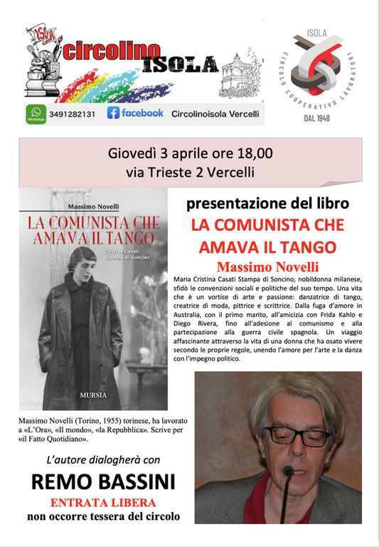 Massimo Novelli, parlerà di lei e del libro che ha scritto su di lei, “La comunista che amava il tango” (Mursia) giovedì 3 aprile alle ore 18 al Circolino dell'Isola (ingresso aperto a tutti). Con lui, ci sarà Remo Bassini.
