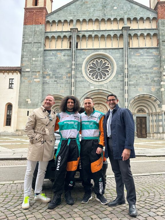 A salutarli, augurando loro «in bocca al lupo» da parte di tutta la città, sono stati l'assessore allo Sport, Mimmo Sabatino e il consigliere comunale Stefano Giriolo che, davanti alla basilica di Sant'Andrea, hanno partecipato alla presentazione dell'auto del raid.