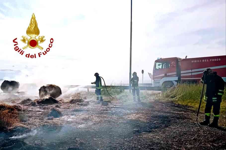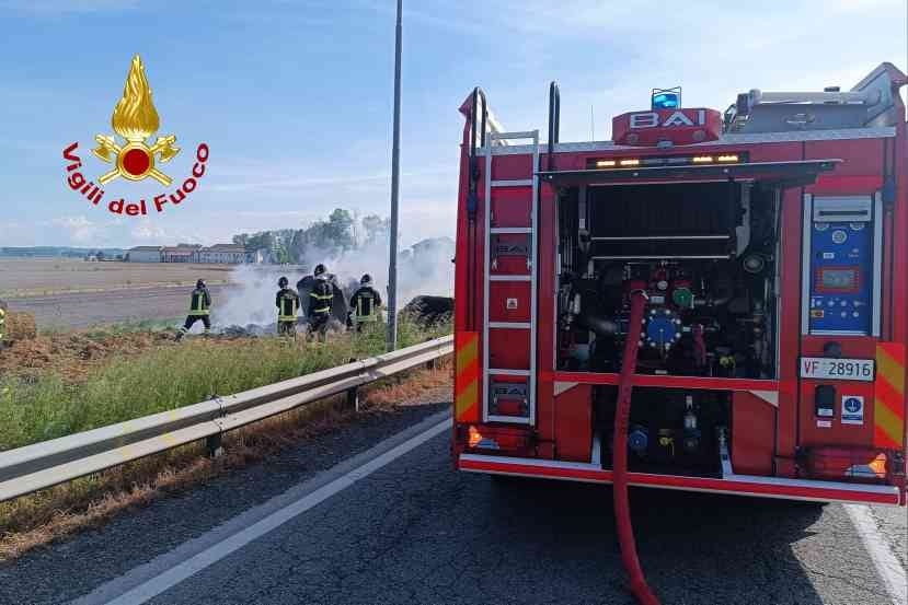 Rotoballe in fiamme, nel pomeriggio di sabato. Intorno alle ore 16 la squadra dei Vigili del Fuoco della Centrale di Vercelli insieme a quella dei mezzi speciali con l'autobotte sono intervenute sulla Sp455 nel comune di Desana per l'incendio di rotoballe di fieno trasportate su un rimorchio.