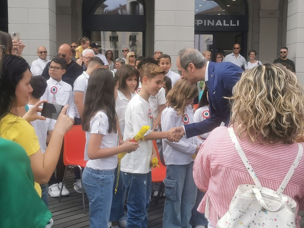 Una cerimonia seguita da molti vercellesi quella che ha festeggiato il 79° anniversario di fondazione della Repubblica Italiana. Autorità, forze dell'ordine, associazione d'arma e combattentistiche, studenti e soprattutto molti cittadini si sono dati appuntamento in piazza Cavour per un momento di riflessione e festa. Aperta con l’alzabandiera e l’inno nazionale cantato dai bambini della Regina Pacis, seguiti dagli onori militari la cerimonia ha visto i saluti istituzionali del Prefetto, Lucio Parente che ha sottolineato il peso della guerra di Liberazione nella fondazione della nuova Italia e il lavoro dell'Assemblea Costituente nella stesura della Costituzione che, da quasi 80 anni, rappresenta il pilastro dello stato.