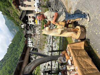 Vicino allo storico ponte erano stati posizionati banchetti che proponevano i prodotti tipici locali e dell’artigianato, quelli autentici!, che sono stati molto apprezzati, anche dalle persone che venivano da altre realtà territoriali. Oltre il ponte il maestro scultore Ireneo Passera esponeva alcune opere realizzate con il marmo bianco del Massucco ed offriva come ricordo delle scagliette del pregiato marmo locale. Lo scultore Marco Schena di Cellio, mostrava la tecnica della scultura lignea.