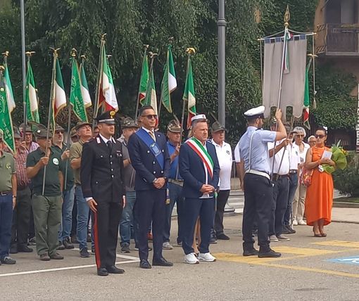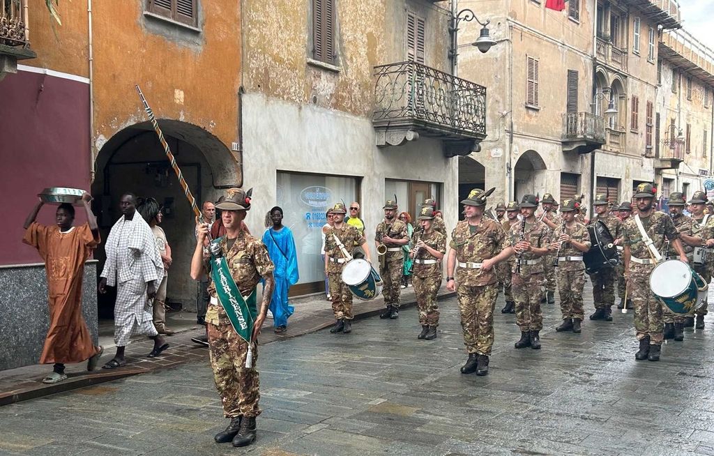 Il tempo sembrava improvvisamente accelerare, la piazza si riempiva: arriva la Fanfara Taurinense e si schiera, si attende l’arrivo del Presidente della Provincia, Davide Gilardino, e al suono di “Fratelli d’Italia” si assiste all’alzabandiera. Impeccabile il Vice Capogruppo del Gruppo Alpini di Serravalle, Walter Pagani, che durante la “naja” era stato promosso sergente, ordina l’attenti e il riposo, scandendo il rituale della cerimonia, mentre la S.R.E di Grignasco assicura l’assistenza sanitaria. Si forma il corteo che sfila per le strade del paese, accompagnato da applausi. In Piazza I maggio viene deposta una corona al Monumento ai Caduti di tutte le guerre, mentre la Taurinense suona “La canzone del Piave”. A San Martino viene deposta una corona al monumento all’Alpino, dedicato a tutti gli Alpini “andati avanti”, accompagnata dal Silenzio fuori ordinanza.