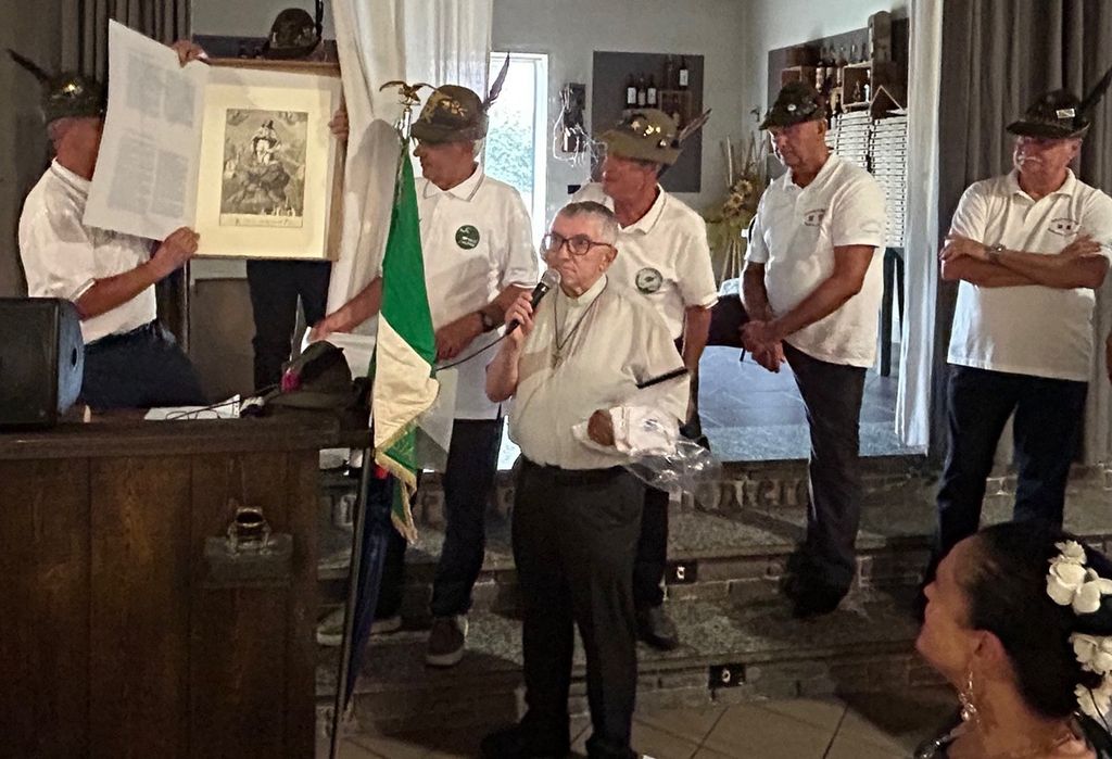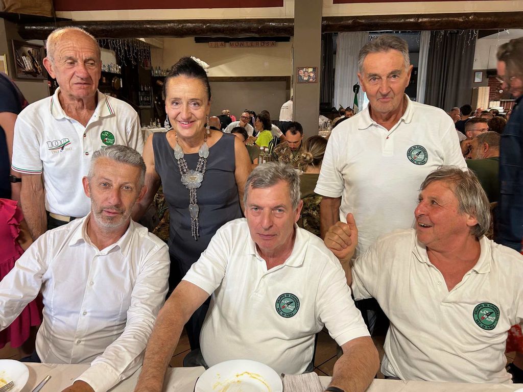 Ammainabandiera e “riposo”, prima di avviarsi al “rancio alpino”, offerto al ristorante Monterosa, che accoglie 150 persone e serve un ottimo pranzo. Alessandro Scavarelli ha ricordato che suo nonno Remo dai tre anni lo portava sulle spalle alle sfilate e fu l’inventore della pèla, l’attrezzo utilizzato per le castagnate alpine. Il suo dono al Gruppo di Serravalle è stato una grande penna nera in legno con la scritta del centenario.