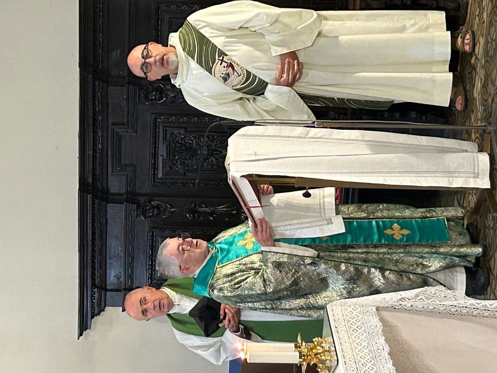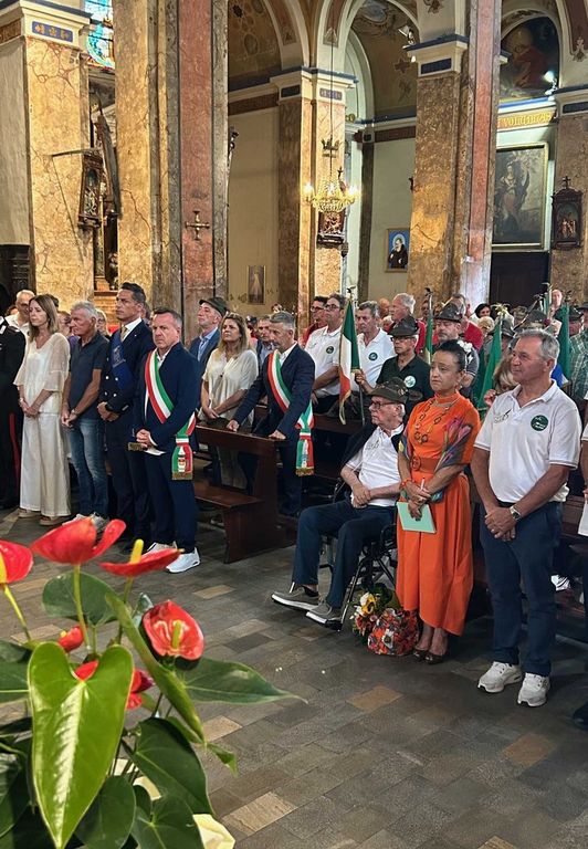 Il corteo si avvia verso la Chiesa Parrocchiale di San Giovanni Battista. La messa solenne è concelebrata dal parroco, don Ambrogio Asei Dantoni, da monsignor Gianluca Gonzino e dai due diaconi, Emilio Forte e Marco Avondo, ed è accompagnata dal suono dell’organo e dalla Corale. Nell’omelia monsignor Gonzino, commentando la parabola del Buon Samaritano, ha messo in evidenza i valori che sono condivisi dagli Alpini di ieri e di oggi: dedizione verso il prossimo e verso la Patria, generoso altruismo, premurosa solidarietà, ricordando i protettori: San Maurizio e il Beato Don Secondo Pollo. All’offertorio gli Alpini portano i doni. Al termine della funzione religiosa, dopo la Preghiera dell’Alpino scandita da Ermes Pasteris e il commovente canto Signore delle cime, si è ricostituito il Corteo, non interrotto dalla pioggia battente.