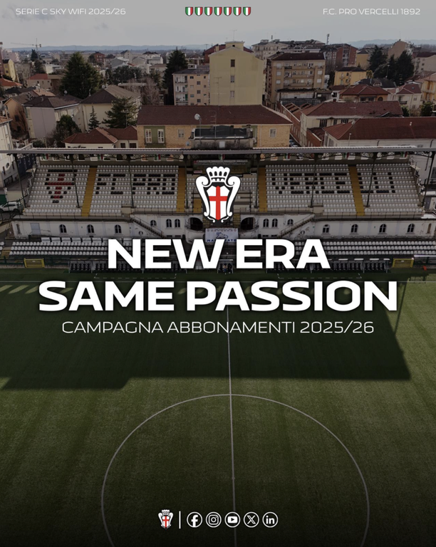 "Cari Tifosi della Pro Vercelli, Oggi inizia una nuova era per la nostra amata Pro Vercelli. Grazie all’acquisizione da parte del nostro gruppo Bridge Football Group, siamo pronti a scrivere insieme un nuovo capitolo della nostra gloriosa storia. La Pro Vercelli è un simbolo di tradizione, passione e identità. Il nostro obiettivo è chiaro: costruire un progetto solido, sostenibile e ambizioso, che riporti il nostro club al livello che merita, sempre con il rispetto e l’orgoglio che da oltre un secolo ci contraddistinguono. Vogliamo una squadra che rispecchi i valori di questa città e della sua gente: determinazione, spirito di sacrificio e fame di vittoria. Ma soprattutto, vogliamo farlo insieme a voi, che siete il cuore pulsante della Pro Vercelli. Per questo motivo oggi lanciamo la Campagna Abbonamenti 2025/26, con lo slogan: “New era. same passion”.