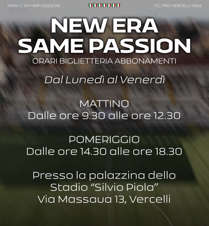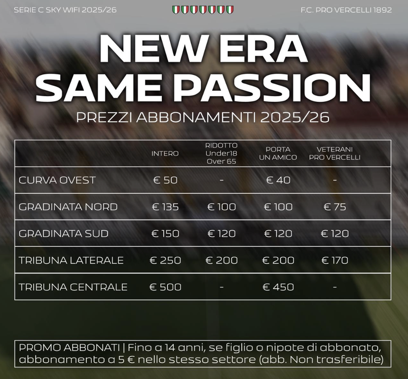 Nei prossimi giorni comunicheremo tutte le informazioni dettagliate su prezzi, agevolazioni e modalità di sottoscrizione.Uniti si vince. È il momento di stringerci intorno alla squadra, difendere i nostri colori e lottare per riportare la Pro Vercelli dove merita di stare. Grazie per la vostra passione, la vostra fiducia e il vostro sostegno.