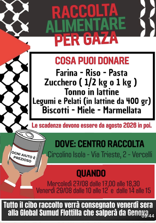 Raccolta alimentare per Gaza, oggi, mercoledì, dalle ore 17 alle ore18,30, e venerdì 29, dalle 10 alle 12 e dalle 14 alle 15 al Circolino dell'Isola, via Trieste 2.