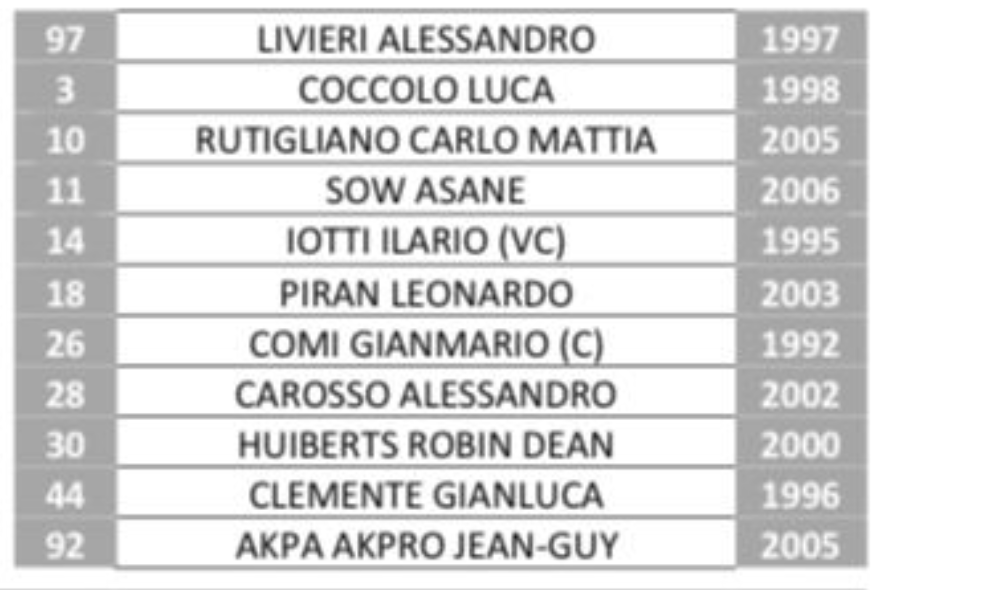 A disposizione: Passador, Lancellotti, Pino, Marchetti, Tarantola, Ronchi, Thiam, Emmanuello, Burruano, Mallahi, O. Sow, Coppola. All. Santoni.
