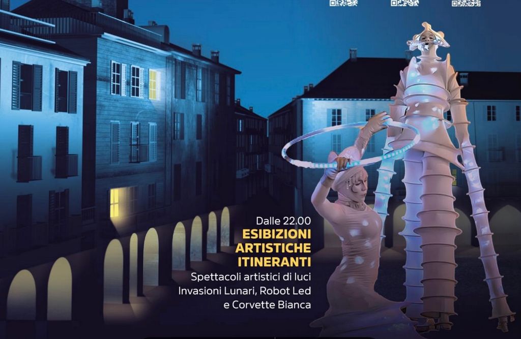 Tutte le sere, a partire dalle 22 esibizioni itineranti animeranno il centro: venerdì prepariamoci alle "Invasioni lunari", sabato arriveranno in città i "Robot led" e domenica sera le "Luci itineranri". Birra e buona musica al Porto Birra di via Morosone, così come piatti a base di riso, buon vino e musica dal vivo da Vinomio in via Dante. In via Nigra dj set da Angelico; in via Gioberti aperitivi, cene, musica dal vivo e dj set da Melty Cocktail Club e ristorante pizzeria Nuova Capri. Aperitivi e musica al Bar Glamour e Giudicami in corso Libertà. Zoe Caffe’ Bistrot apre in parco Kennedy e vi aspetta con panini, riso e cocktail accompagnati da buona musica. Apericena, Cocktail, musica e balli caraibici al Portico 4 di piazza Cavour e in via dei Mercati aperitivi, apericena e musica alla Salsamenteria. Ancora: in piazza Cavour Taverna e Tarnuzzer con aperitivi e musica dal vivo e pizza e non solo con Real Piper.