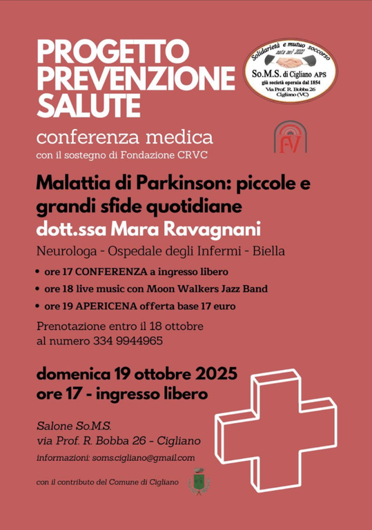 Domenica 19 ottobre alle ore 17, alla So.M.S. in via prof.R.Bobba 26, la dott.ssa MARA RAVAGNANI, neurologa dell'Ospedale degli Infermi di Biella terra' una conferenza su "Malattia di Parkinson: piccole e grandi sfide quotidiane". Una patologia che interessa non poche persone e che si riverbera non solo sulla persona malata ma anche sui componenti della famiglia.