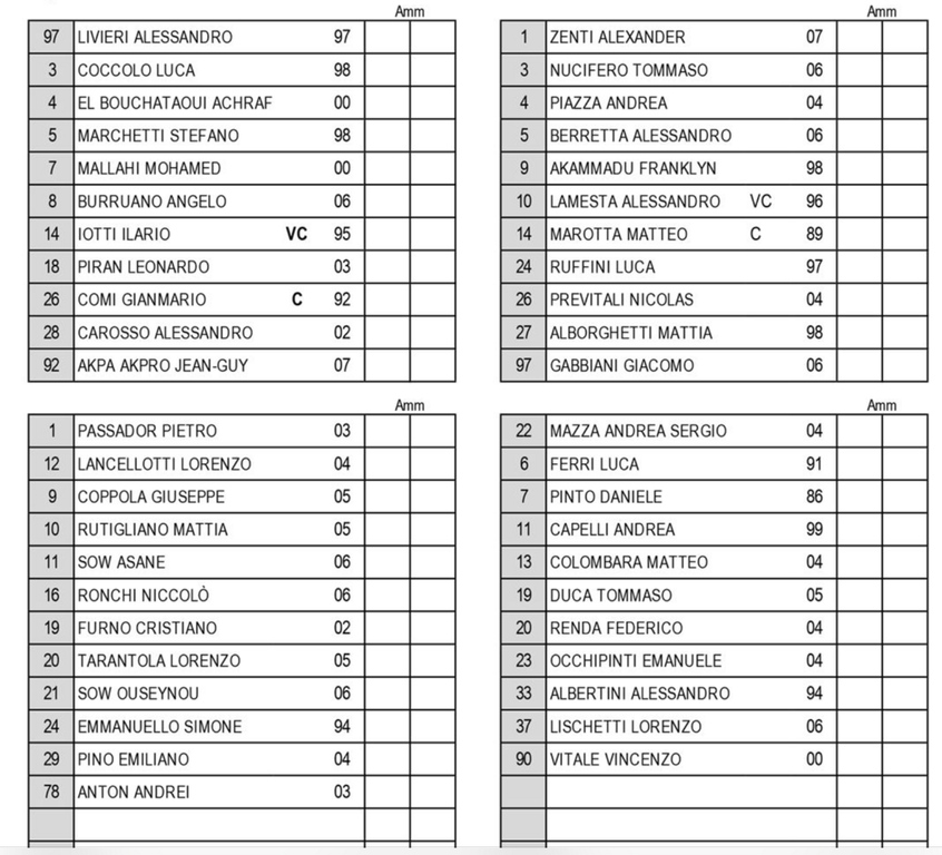 Livieri; Piran, Marchetti, Coccolo, Carosso; Iotti, El Bouchataoui, Burruano; Mallahi, Comi, Akpa Akpro.