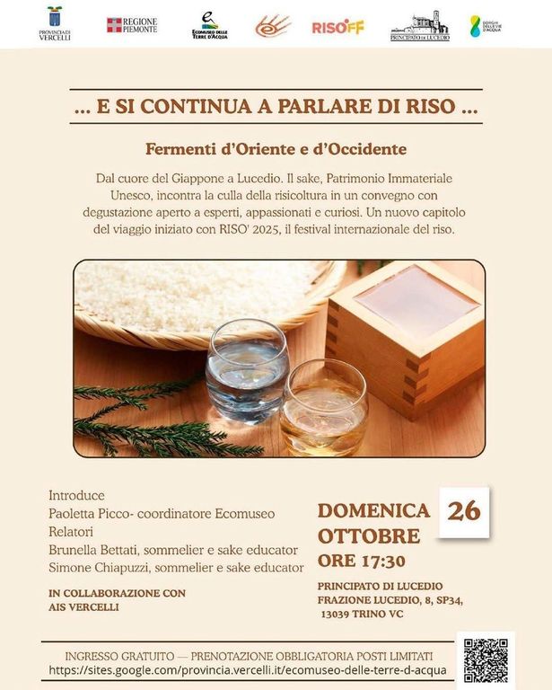 Dopo Risò, si continua a parlare di riso con una serie di iniziative sul territorio. Prima tra tutte, la masterclass dal titolo “Fermenti d’Oriente e d’Occidente. Dal cuore del Giappone a Lucedio” che si terrà domenica 26 ottobre nella sala Capitolare dell’abbazia di Lucedio (con inizio alle ore 17,30).