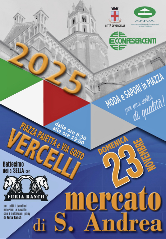 Domenica 23 novembre ritorna in Piazza Pajetta e in Via Goito il Mercato di S. Andrea, organizzato da Confesercenti con il patrocinio del Comune di Vercelli. Un appuntamento ideale per i primi acquisti natalizi, per rinnovare il guardaroba e per scoprire proposte enogastronomiche che allieteranno ogni tavola.