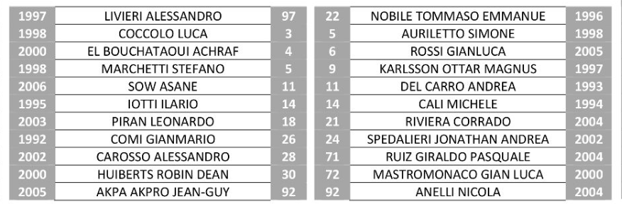 Pro Vercelli: Livieri; Piran, Marchetti, Coccolo, Carosso; Iotti, Huiberts, El Bouchataoui; Akpa Akpro, Comi, A. Sow. A disposizione: Passador, Mallahi, Burruano, Coppola, Haoudi, Ronchi, Tarantola, O. Sow, Pino, Anton. All. Santoni.