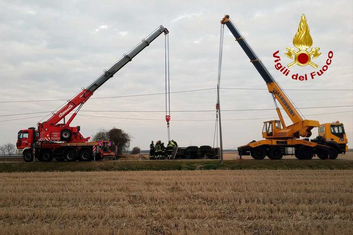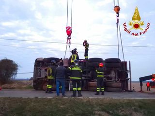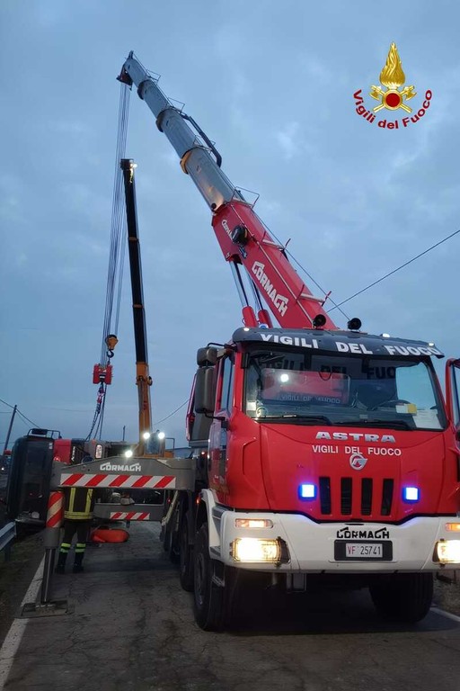 L'operazione congiunta tra l'autogrù dei Vigili del Fuoco e un'altra privata ha permesso di raddrizzare il mezzo pesante che è stato rimesso in sicurezza e rimosso. Presente la Polizia Locale Nuova Luce per la gestionde della viabilità.