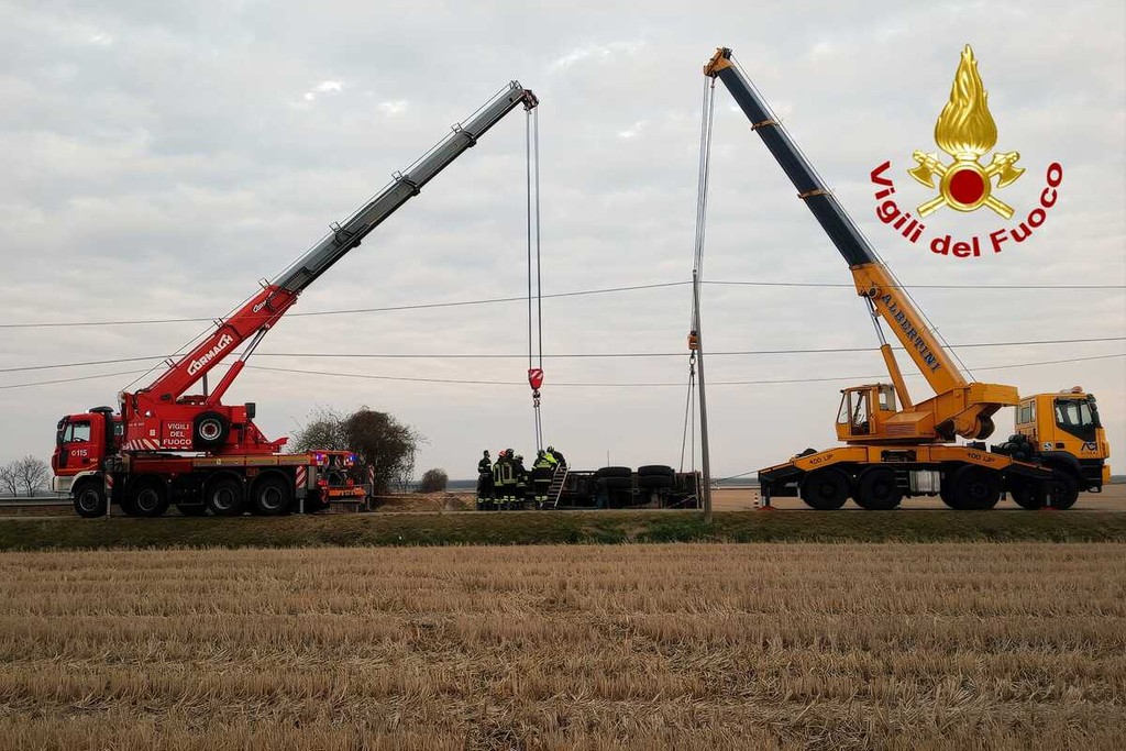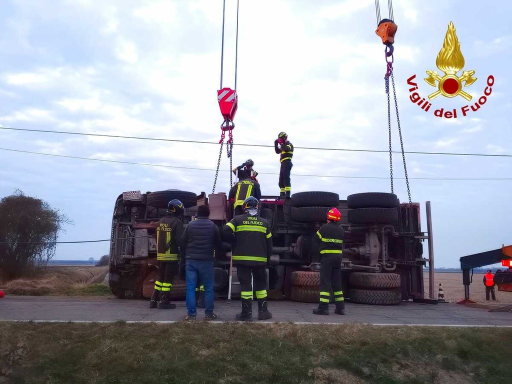 E' stato necessario l'intervento di una squadra dei Vigili del Fuoco del distaccamento Volontario di Santhià e di quella della Centrale di Vercelli con l' autogru per recuperare un mezzo pesante uscito di strada sulla SP26 nel comune di Tronzano, davanti alla Cascina Pucchiotta.