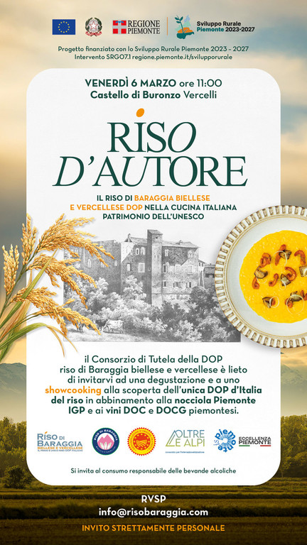 L’evento, promosso dal Consorzio di Tutela della DOP Riso di Baraggia Biellese e Vercellese, punta a valorizzare una produzione che rappresenta un’eccellenza agricola del Piemonte, legata in modo indissolubile al territorio tra Biellese e Vercellese.