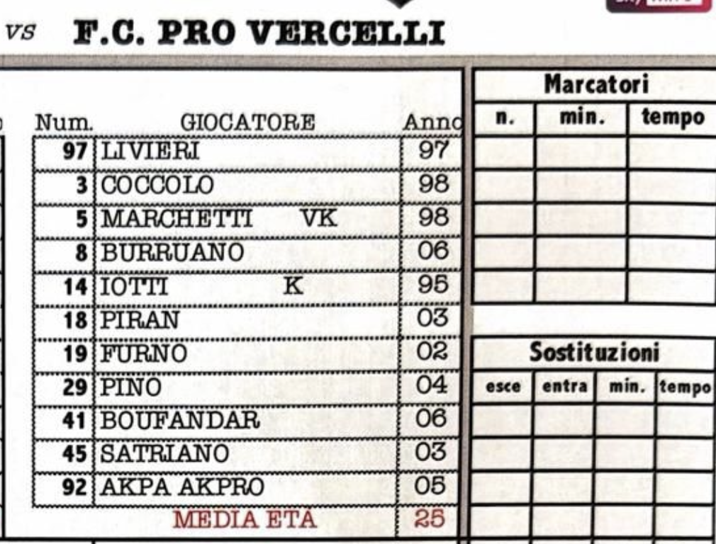 PRO VERCELLI: Livieri; Piran, Marchetti, Coccolo, Furno; Boufandar, Iotti, Burruano; Akpa Akpro, Satriano, Pino. A disposizione: Anfossi, Rosin, Mallahi, Rutigliano, Ronchi, Perotti, Comi, Carosso, Huiberts, Zacchera, Clemente, Regonesi. All. Santoni.